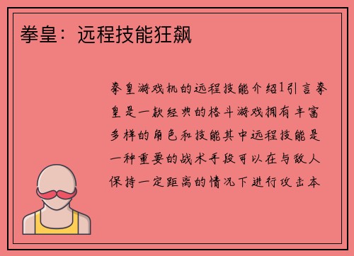 拳皇游戏机的远程技能介绍 1. 引言 拳皇是一款经典的格斗游戏,拥有丰富多样的角色和技能。其中,远程技能是一种重要的战术手段,可以在与敌人保持一定距离的情况下进行攻击。本视频将详细介绍拳皇游戏机中的远...