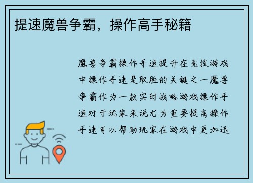 魔兽争霸操作手速提升 在竞技游戏中,操作手速是取胜的关键之一。魔兽争霸作为一款实时战略游戏,操作手速对于玩家来说尤为重要。提高操作手速可以帮助玩家在游戏中更加迅速、准确地做出反应,增加胜利的机会。本文...