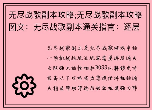 无尽战歌副本是《无尽战歌》游戏中的一项挑战性玩法,玩家需要逐层通关,击败强大的怪物和BOSS,以解锁史诗装备。以下攻略将为您提供详细的通关指南,帮助您逐层破敌。南宫...