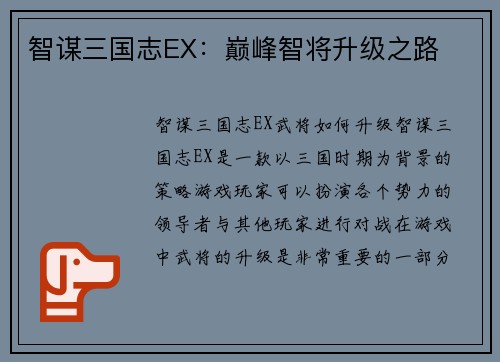 智谋三国志EX武将如何升级 智谋三国志EX是一款以三国时期为背景的策略游戏,玩家可以扮演各个势力的领导者,与其他玩家进行对战。在游戏中,武将的升级是非常重要的一部分,它直接关系到玩家在游戏中的实力和竞...